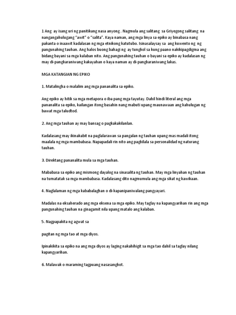 Kabilang sa simula ang mga tauhan tagpuan at suliranin. EPIKO Ang epiko ay uri ng panitikan na tumatalakay sa mga kabayanihan at pakikipagtunggali ng isang tao o mga tao laban sa mga kaaway na halos hindi mapaniwalaan dahil may mga tagpuang makababalaghan at di-kapani-paniwala. Matatalinhagang salita Ang mga matatalinhagang salita ay ang mga salitang hindi nagbibigay ng direktang kahulugan.