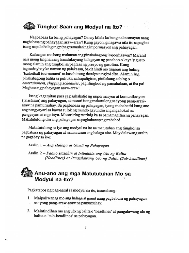 Isang espesiyalisadong uri ng pagsulat na tumutugon sa mga kognitibo at sikolohikal na pangangailangan ng mga mamasyong maari makatulong sa. Ito ay isang talaan ng mga pahayagan na kasalukuyang inilalathala sa Pilipinas. Anu-ano ang mga bahagi ng pahayagan.