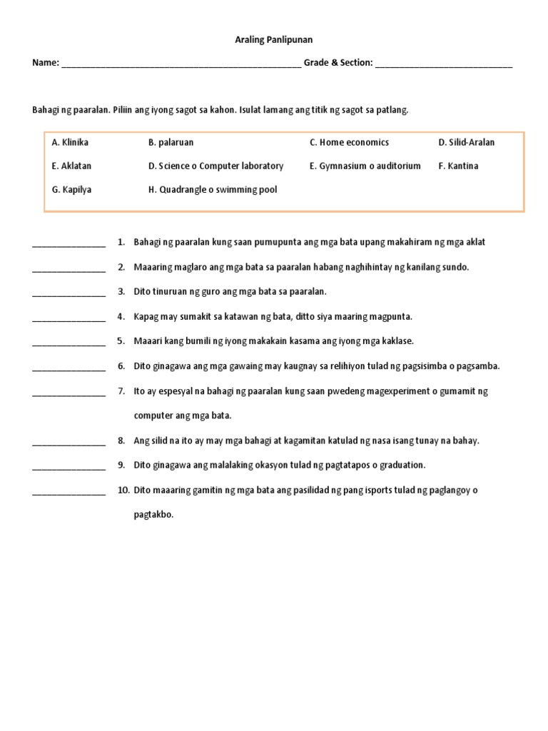 Displaying all worksheets related to - Mga Bahagi Ng Paaralan. Click on Open button to open and print to worksheet. 10 Questions Show answers.